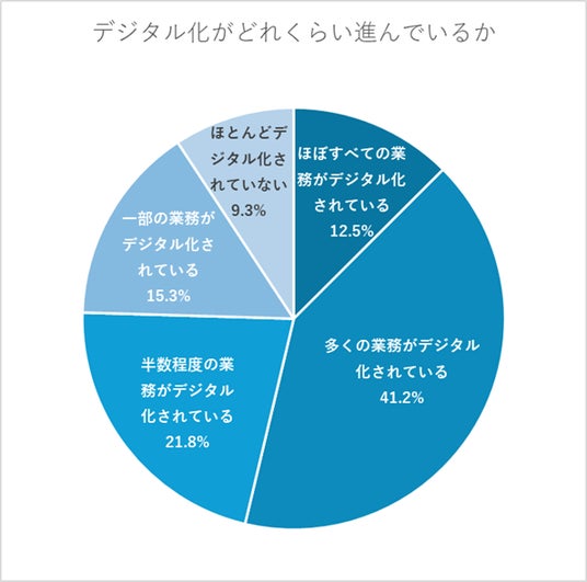 「ほぼすべての業務がデジタル化されている」が12.5%、「多くの業務がデジタル化されている」が41.2%で、合わせて53.7%でデジタル化が進んでいるという結果になりました。