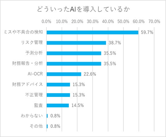 「ミスや不具合の検知」が59.7%と圧倒的に多い結果になりました。業務の性質上、ミスが許されないことから、ミスの防止を重要視していることがわかります。次いで、「リスク管理」「予測分析」「財務報告・分析」など、財務・会計における分析にAIの需要があると考えられます。