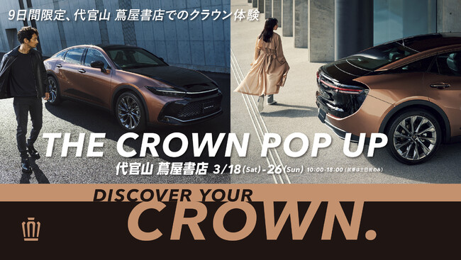 トヨタ自動車株式会社(本社:愛知県豊田市・代表取締役社長:豊田章男)は、2023年3月18(土)から3月26日(日)の期間、代官山 蔦屋書店の協力のもと、クラウンの魅力を体験できる9日間限定ポップアップイベント『DISCOVER YOUR CROWN. THE CROWN POP UP』を開催いたします。このイベントは、店舗外ショールームとして、車両展示や試乗体験、購入相談など、クラウンの魅力を存分に味わっていただく場としてお届けいたします。