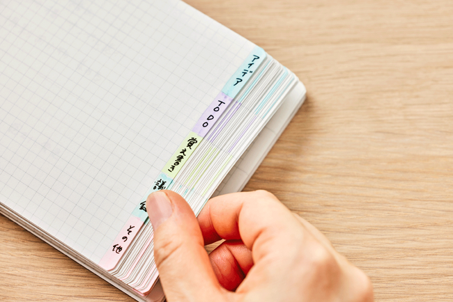 各ページの端には、5つの見出しスペースが設けられています。マーカーで色分けでしたり、タイトルを書きこむことで、内容の整理や検索がしやすくなります。