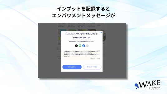 ログ機能のもう一つの課題には、記録が続かないことが挙げられます。WAKE Career のインプットログは、ユーザーがログ記録を継続できるよう、登録完了時に著名な女性のエンパワメントメッセージを表示します。毎回どんなメッセージが送られるか楽しみにしましょう!WAKE Career では今後もエンパワメント要素をプロダクトに散りばめていき、使っているだけで挑戦し続けたいと思えるプラットフォームを目指します。