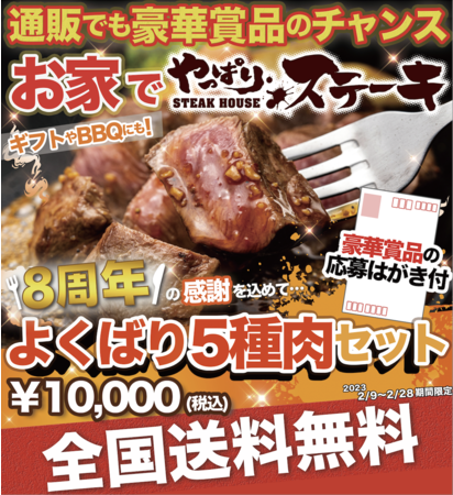 ■やっぱりステーキ公式オンラインショップにて、8周年特別セット「よくばり5種肉セット」を販売予定。