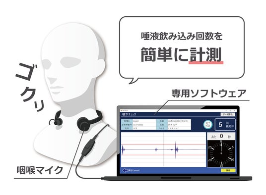 太平洋工業株式会社(本社:岐阜県大垣市、代表取締役社長:小川哲史)は、 2024年1月16日(火)にオーラルフレイルチェックをより身近にする「ゴック音」をリリース致します。本製品は、咽喉マイクを首に装着し、30秒間の唾液の飲み込み回数を計測します。計測結果として嚥下回数や嚥下波形を表示し、さらに嚥下音を聞くことも可能です。また、計測結果は記録でき、過去の記録と比較することもできます。パッケージ化されたアプリを通じて、オーラルフレイルチェックをより便利に行うことができると考えています。