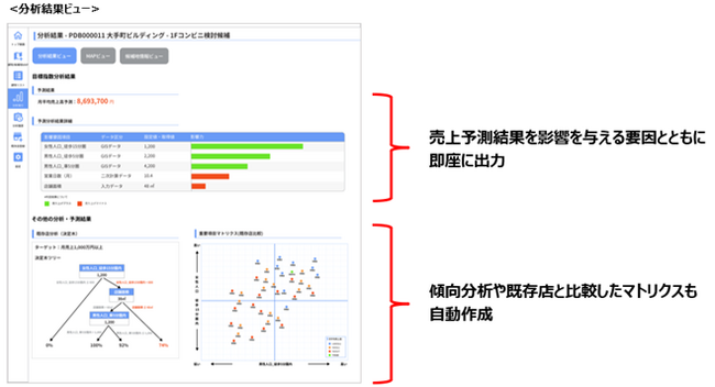 各社専用の分析モデルをシステムに組み込み、売上予測や傾向分析の結果を即座にレポート化。分析モデルは既存店の売上情報や商圏データ、人流データなどのGISデータを基にデータサイエンティストが作成。