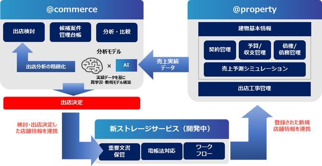 @commerce(アットコマース)に、当社の賃貸管理サービスである@property(アットプロパティ)及び開発中のストレージサービスを連携することで新規出店検討から既存店舗の業務効率化、運営管理、改善までワンストップでご提供いたします。連携につきましては、12月以降に順次行う予定です。