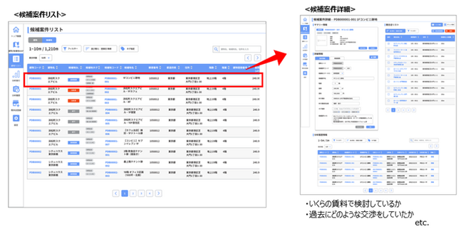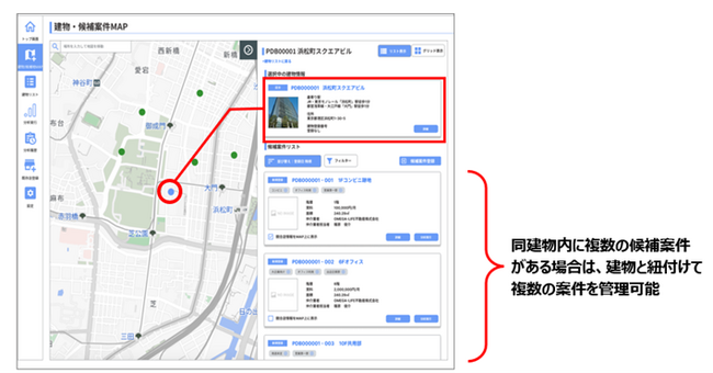 登録された案件情報は自動でMAP上にプロットされ、視覚的に候補案件の管理や比較検討が可能になる。