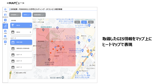 候補案件周辺の最新のGIS*データを取得し、分析に活用することで高精度の分析が可能になる。GISデータ単体での出力も可能。