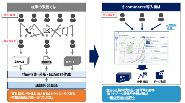 多店舗展開企業様における新規出店の課題は「候補物件や競合情報の共有」「新規出店時の売上予測」「出店経緯や判断等の情報の一元化」などがあげられます。これらの課題を解決するための店舗開発支援クラウド「@commerce(アットコマース)」は、店舗開発に関わる大量のデータを一元管理・共有するとともにデータに基づいた商圏分析、競合分析、売上予測により、素早い出店判断を実現します。