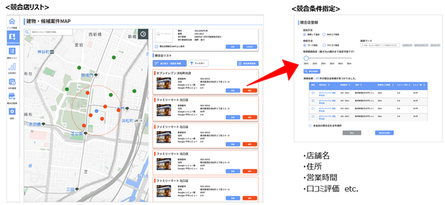競合店舗情報を指定した条件をもとに検索・取得することができ、競合数や立地関係を瞬時に確認できる。
