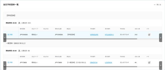 受付窓口で活用する団体予約リストを、マニフェスト機能を活用することでみやすく一覧で表示することができます。これにより、日毎の団体予約リストが確認でき、CSVやPDFに出力することもできるため、別途受付表を作成する手間がなくなり、窓口業務が効率化されます。