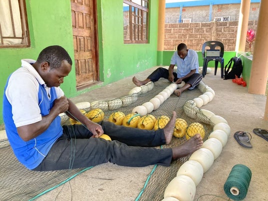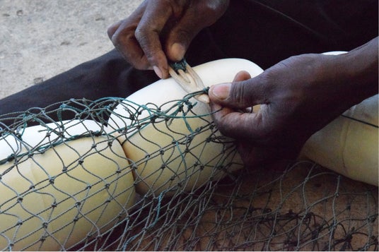 漁網を修復するための道具を用いて回収装置の網部分と浮きをつなげていく作業の様子