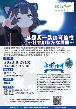 この度、多くの方にメタバースについて知ってもらうため、VR メタバースを活用した不登校支援などを行う水瀬ゆず(みなせ ゆず)氏を講師として招き、メタバースの最新情報やトレンド、活用事例などを学ぶことができる初学者向けオンラインセミナー「メタバースの可能性~社会の新たな展開~」を以下のとおり開催します。