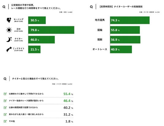 ナイターレースを楽しむ理由は「仕事終わりに集中して予想ができるから」が55.4%、「ナイター独自のレース展開が面白いから」が46.4%で、仕事終わりの趣味として楽しむユーザーの多さが垣間見える結果となりました。