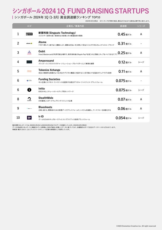 【シンガポール】2024年 1Q スタートアップ資金調達額ランキングTOP10