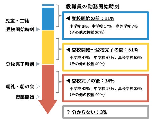 また、教職員の勤務開始時刻と児童生徒の登校時刻の設定についての質問では「登校開始時刻が勤務開始時刻前に設定されている」と答えた教職員が合計で85%となりました。