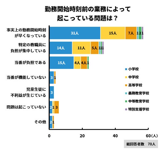 「特定の教職員に負担が集中している」と回答したのは44%でした。「開門を勤務開始時刻と同時にしているので、門前で待機する児童が多くなり、近隣に迷惑がかかっています」との回答もあり、児童生徒の都合と教職員の正規の勤務時間との兼ね合いが難しいことを示すアンケート内容となりました。