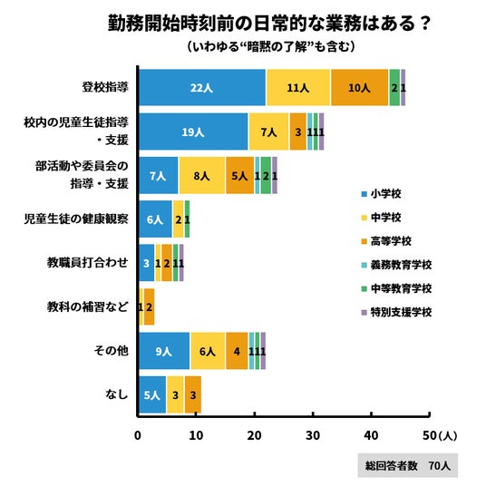 「勤務開始時刻前の日常的な業務がある」と答えた人は全体の84%。児童生徒の登校時間と教職員の正規の勤務時間との兼ね合いの難しさが明らかに。