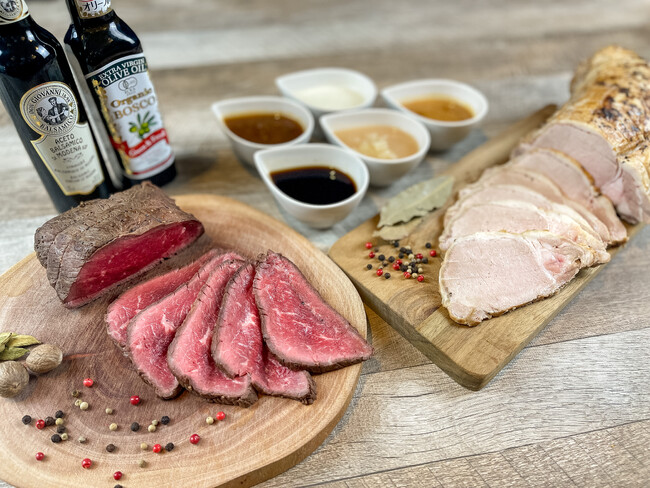 夕食バイキングのスペシャリティメニューとして、口溶け滑らかで爽やかな脂の味わいの「福島県産牛のローストビーフ」と、肉質が柔らかく、脂肪があっさりした「麓山高原豚のローストポーク」をご提供!