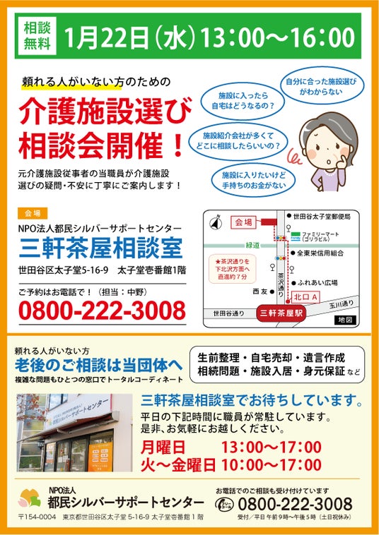 おひとりさま高齢者や、そのご家族への相談支援を行っている NPO法人都民シルバーサポートセンター(東京都世田谷区:理事長 信夫武人、以下「当団体」)は、1月22日に東京都世田谷区三軒茶屋にある当団体相談室にて「介護施設選びのポイント」と題して相談会を開催します。