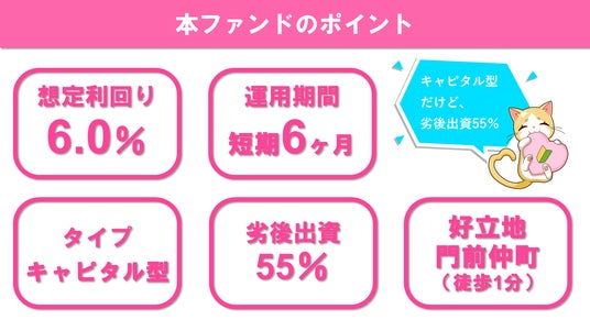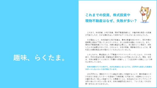 『らくに、たまる』をコンセプトに、不動産知識や投資経験が少ない方でも、1万円から安心して楽しく参加できるファンドの組成を目指します。『らくたま』はいつでも出資者ファーストを考えています。
