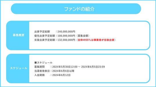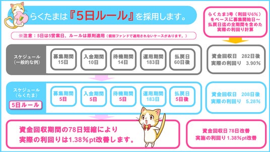 らくたま3号以降のファンドでは、出資者の資金効率を最大限高めるため、らくたまファンド運用スケジュールを見直し、「募集期間」、「入金期間」、「(運用開始までの)待期期間」、「払戻日」の4つの主要日程を(原則として)5営業日以内に短縮する『5日ルール』を採用します。資金効率の向上により、『実際の利回りが大幅に向上すること(下図参照)』『当選発表まで長期間待つ必要がなくなる』等が、らくたま出資者のメリットです。一方で、応募期間と入金期間は短くなりますので、早めのご応募・ご入金をお願いいたします。また、運用終了後は5営業日以内で配当・償還を受け取れるため、出資者の早期資金回収が可能となります。『らくたま』は今後も出資者ニーズを考えたファンドプランをご提供します。