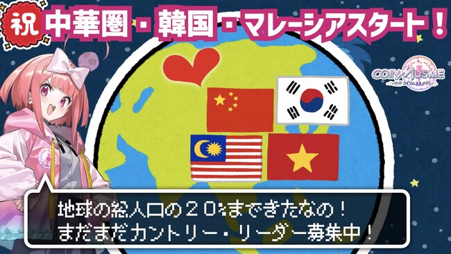 コインムスメでは、公式広報キャラクター「ムスメちゃん」の各国/地域別コミュニティ展開を開始し、そのコミュニティを盛り上げるカントリーリーダーを募集しております。