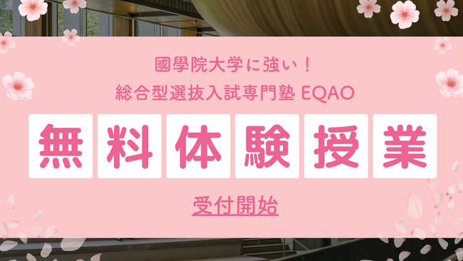 國學院大学は日本で歴史のある人気の大学です。そんな國學院大学の総合型選抜入試対策を得意とする塾「EQAO」。高い合格率と豊富な合格実績を誇る推薦入試対策専門塾EQAOが、総合型選抜入試で國學院大学の合格を狙う高校1・2・3年生を対象に、「先着20名様限定」で、約1時間プロ講師と相談する機会を設けさせていただきます。お申し込みの受け入れ開始時期は、2023年12月13日となります。定員に達した時点で受け入れを停止させていただきます。EQAOの國學院専門コース、専門対策プランでは、志望理由書、活動レポート、課題図書、小論文、面接対策、プレゼンテーション対策などのサポートを徹底的に行うことが可能です。総合型選抜入試・学校推薦型選抜入試・指定校推薦等で國學院大学合格を目指している方はぜひお申し込みください。※保護者様のみの参加も可能です。お申し込みは下記の無料体験授業お申し込みリンクから可能です。※受け入れ数は毎年更新されます。