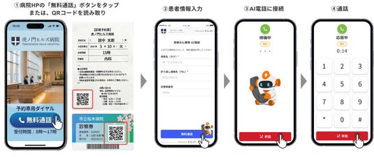 本機能により、患者は病院ホームページ上の「無料通話」ボタンをタップするだけで、通話料無料・電話番号入力不要でAI電話に接続し、診療予約などの手続きが可能になります。専用アプリのインストールも不要で、高齢者を含む幅広い年齢層の患者さんにお使いいただけます。