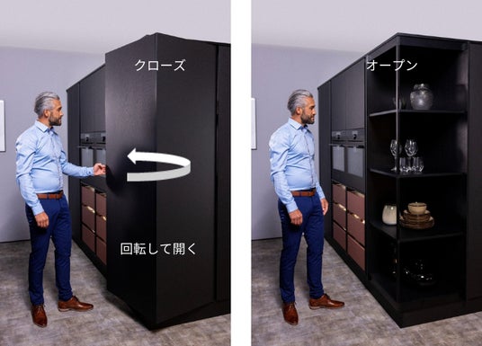 FurnSpin(ファーンスピン)は、今までの既成概念を打ち砕いた、新たな家具デザインの可能性の扉を開けました。これまでの開閉式のキャビネット収納家具の扉は、開き扉、引き扉、折れ扉、上げ下げ扉といったものが一般的でしたが、FurnSpin(ファーンスピン)によって、これまでにない方法で家具が"オープン"にも"クローズ"にも早変わりします。キャビネット自体をスタイリッシュに回転させるだけで家具はオープンになり、もう一度回転すれば再びクローズな状態に様変わりします。FurnSpin(ファーンスピン)は、これまでにない、まったく新しいタイプのキャビネット(箱物)収納家具用金具システムです。