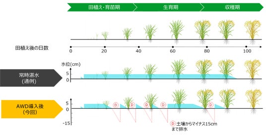 AWDは、水稲の栽培期間中、水を抜いて水田の地表面を十分乾燥させた後、再度湛水(たんすい)するという潅水(かんすい)制御を複数回にわたって繰り返す水管理手法です。水田土壌内にはメタン生成菌が存在し、嫌気条件下では稲わらなどの有機物を餌に温室効果ガスであるメタンを発生させますが、断続的に水田から水を抜くことで常時湛水時より土壌中により多くの酸素を供給すると、メタン生成菌の活動が抑制され、メタン排出量が低減します。
