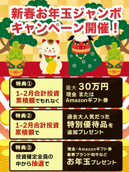 CAPIMAでは、日頃ご愛顧いただいている会員の皆様に新年の感謝の気持ちを込めて、Amazonギフト券や現金、特産品がもらえるおトクな新春キャンペーンを実施いたします。これまでアカウント開設や投資のきっかけがなかった方も、ぜひこの機会をご活用ください!