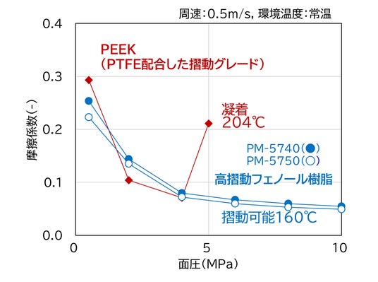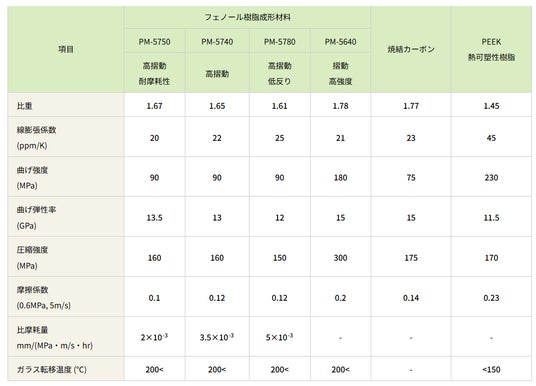 注記:上記のデータは参考値です。 フェノール樹脂については、試験片は射出成形で作製し、アニール後にISO規格に準じて測定しています。摩耗試験はS45Cに対して実施しています。