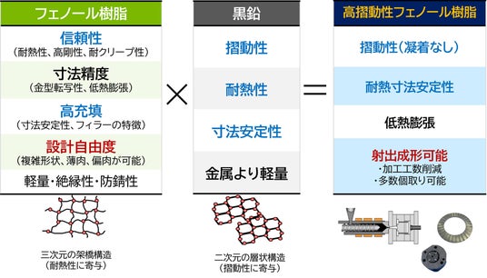 フェノール樹脂成形材料 スミコン(R) PM-5700シリーズについてフェノール樹脂成形材料スミコン(R) PM-5700シリーズは、高耐熱のフェノール樹脂と高い摺動性を実現する黒鉛を充填させた高摺動・高耐熱フェノール樹脂成形材料です。独自の配合により、「滑る・融けない高耐熱プラスチック」を実現しています。また、本製品シリーズは、インジェクション成形に対応しており、熱硬化性樹脂の溶融時に低粘度である特徴を活かした薄肉成形や偏肉成形が可能であり、設計の自由度が向上するというメリットもあります。