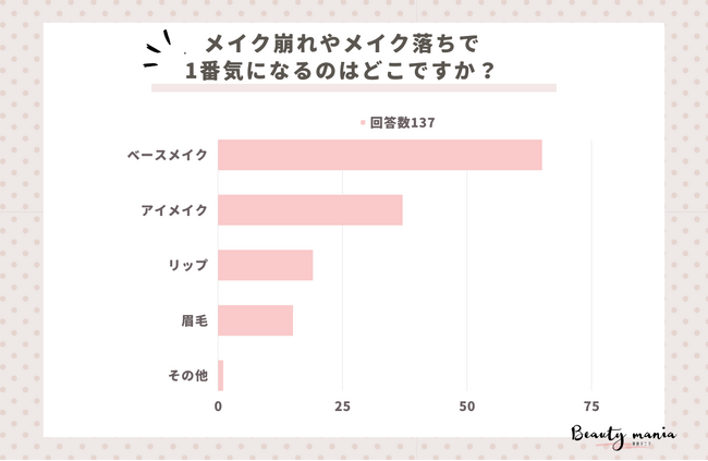 「メイク崩れやメイク落ちで1番気になるのはどこですか?」とアンケート調査した結果、1位は『ベースメイク(65人)』、2位は『アイメイク(37人)』、3位は『リップ(19人)』となっています。