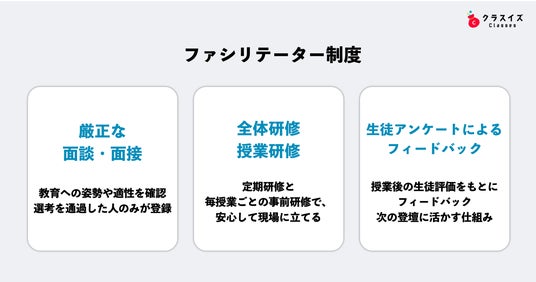 ファシリテーターの登録にあたっては、書類審査とオンライン面談を実施。教育に対する姿勢やコミュニケーション力、生徒への関わり方などを重視し、適性を見極めた上で登録を行っています。教育経験の有無は問いませんが、生徒の前に立つ責任を理解し、授業の目的に沿って役割を果たせる方のみが現場に入ります。