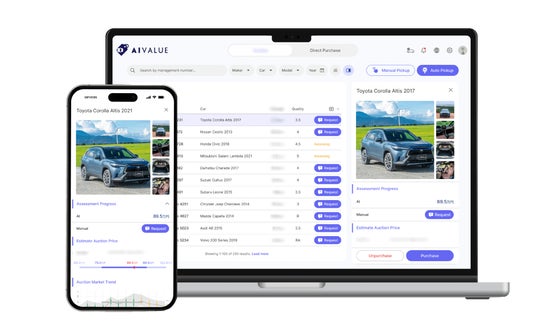「AIVALUE」は、中古車販売・買取業者やリース・レンタカー事業者など、中古車ビジネスに関わるあらゆる事業者を対象に、取引の効率と透明性を飛躍的に高め、ビジネスの成長を強力に支援するAIソリューションです。
