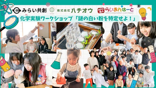 今回は、株式会社ハチオウ(廃棄薬品等の再生処理大手)と、企業・高校生・大学生をつなぎ新たな価値を創出する「株式会社みらい共創」による化学実験ワークショップ「謎の白い粉を特定せよ!」です。