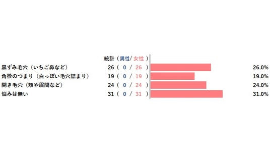 ──────────────────────────────今回のアンケートで「毛穴悩みの種類はなんですか?」とアンケート調査をした結果、1位は『悩みはない』でした。