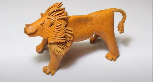 ライオンのたてがみや、ゾウの鼻のシワなど、細かい部分の質感もリアルに表現された、手のひらサイズの動物たち。よく見ると、どれも革でできています。