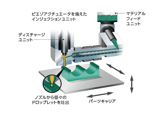 溶かされた劇脂はディスチャージユニットを介して、ノズル先端から微細なドロップレット(液滴) 状に吐出。これを高精度に配列しながら積層することで、要求形状を造形します。
