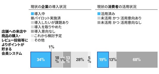 - 企業側の導入状況に比して消費者への浸透が進まないテクノロジーの1つとして、OMO(Online Merges with Offline)ロイヤルティプログラムである「店舗への来店や商品購入等でポイントが貯まる会員システム」があげられる(導入中の企業:34%、活用済みの消費者:19%)。