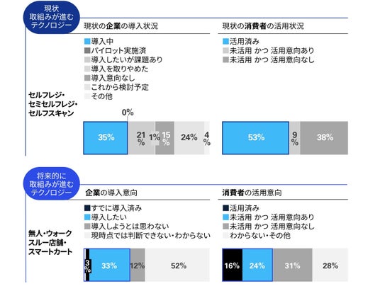 - 企業側の導入状況を上回る形で消費者の活用状況が上回ったテクノロジーの1つとして、「セルフ化や無人店舗」があげられる(導入中の企業:35%、活用済みの消費者:53%)。