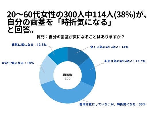 20~60代女性を対象とした「自分の歯茎が気になることはありますか?」というアンケートで最も多かった回答は「C.普段は気にしていないが、時折気になる」で300人中全体の38%が回答しました。また、「D.かなり気になる」(18%)、「E.非常に気になる」 (12.3%)となり、「気になる(時折、かなり、非常に)」の回答が68.3%となり、約7割の女性が歯茎を気にしていることがわかりました。
