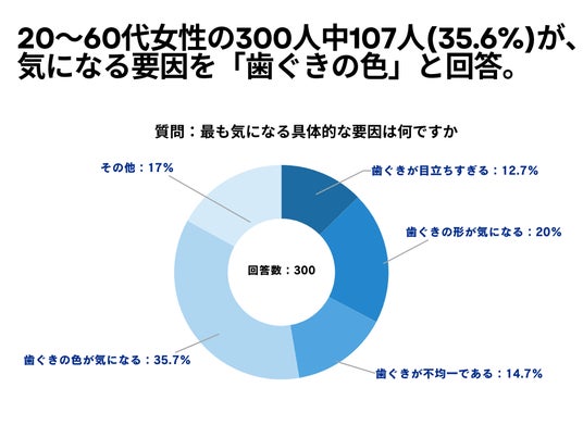 「最も気になる具体的な要因は何ですか?」というアンケートで最も多かった回答は「D.歯ぐきの色が気になる」で全体の35.7%となりました。次いで多かったのが「B.歯ぐきの形が気になる(20%)という結果になりました。