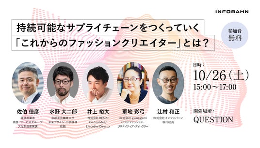 株式会社インフォバーン(TNLメディアジーン グループ会社、以下インフォバーン)は、10月26日(土)に、『持続可能なサプライチェーンをつくっていく「これからのファッションクリエイター」とは?』と題し、経済産業省が主催し、インフォバーンが事務局を務める「みらいのファッション人材育成プログラム」の関連イベントを開催いたします。