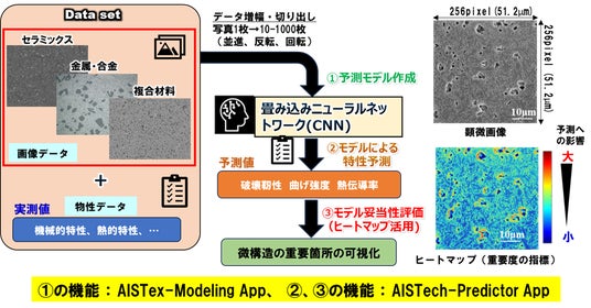 AISTex-Modeling AppとAISTech-Predictor App は材料の画像と特性を関連付けるアプリ群です。前者は自社のデータを学習に用いてモデルを作成するアプリです。後者は、前者で作成した深層学習モデルを利用して、新たに取得した画像から特性を予測するアプリです(図1)。
