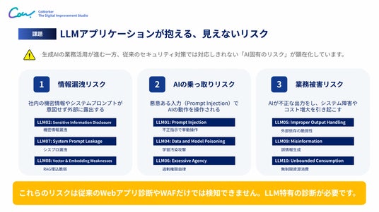 AIセキュリティソリューションを開発・提供するCoWorker株式会社(本社:東京都新宿区、代表取締役:山里一輝、以下「当社」もしくは「CoWorker」)は、生成AI/LLM利用に特化した「LLM診断サービス」を提供開始しました。