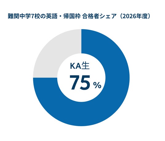 難関7校において、対象入試区分の総合格者374名のうち282名をKA生が占め、75.4%のシェアを記録しました。前年に引き続き約75%台の高い合格シェアを維持し、帰国生・英語入試における安定した成果を示しています。