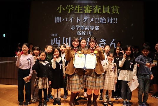 小学生審査員賞を受賞し、プレゼンターの小学生たちと記念撮影する受賞者