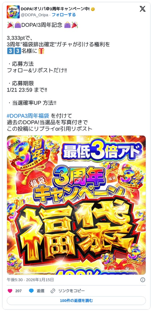 DOPA!は、サービス開始3周年を記念し、抽選で福袋排出確定ガチャが引ける「3周年福袋キャンペーン」を開催いたします。